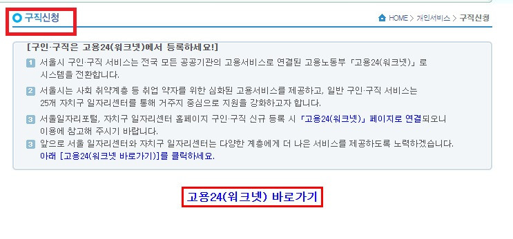 ④ 구인, 구직 신규등록 시 고용 24시(워크넷)에서 먼저 신규등록을 하셔야 구직 이력서를 제출할 수 있으니 아래의 버튼을 확인하세요.