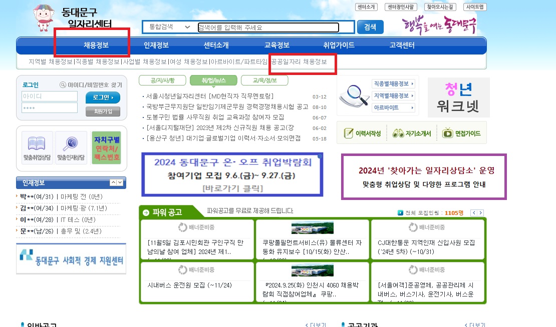 ① 동대문구청 일자리센터에 접속하면, ‘지역별 채용정보’ , '공공 일자리 채용정보'등 메뉴에서 원하시는 일자리를 검색할 수 있습니다.